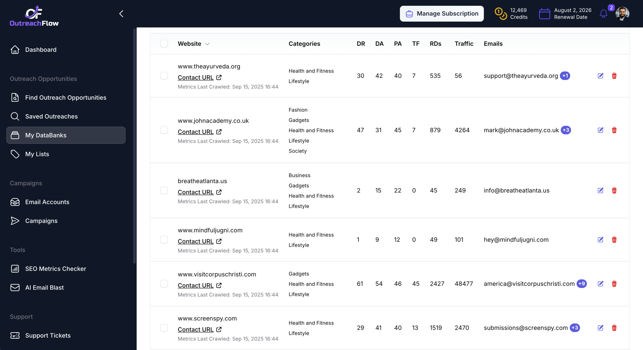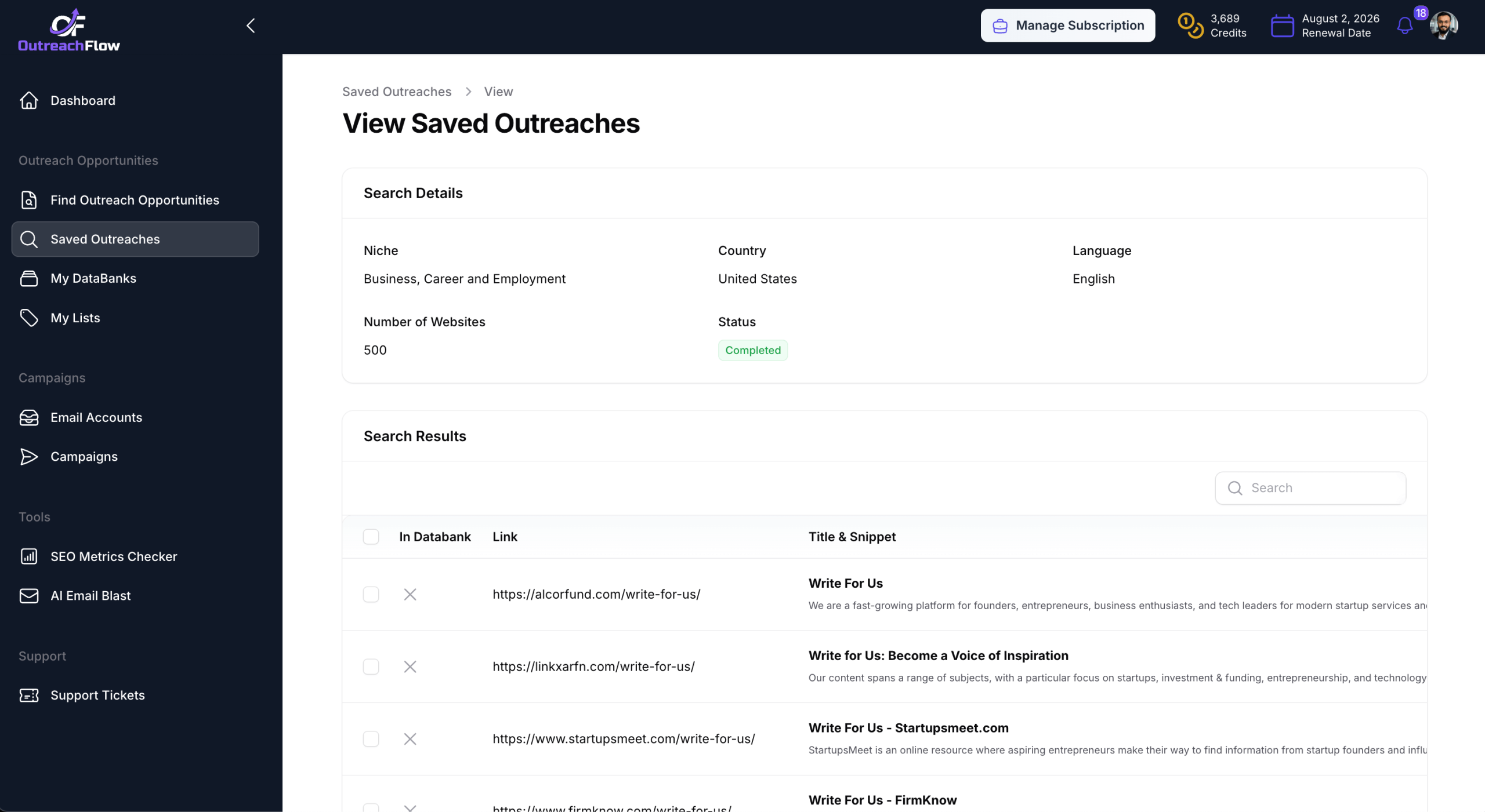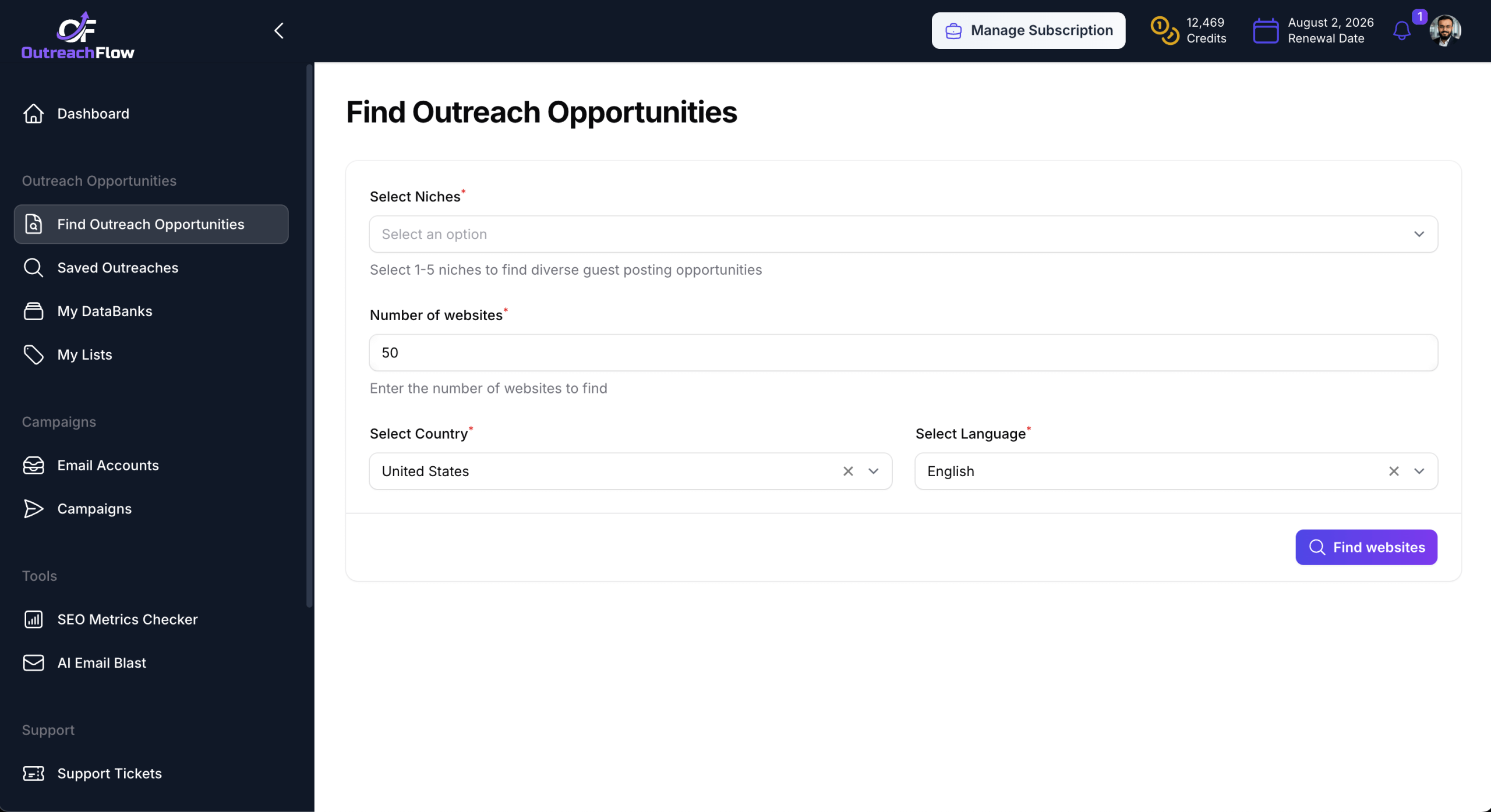 Input your topic. OutreachFlow scrapes the SERPs and pulls in websites that are: