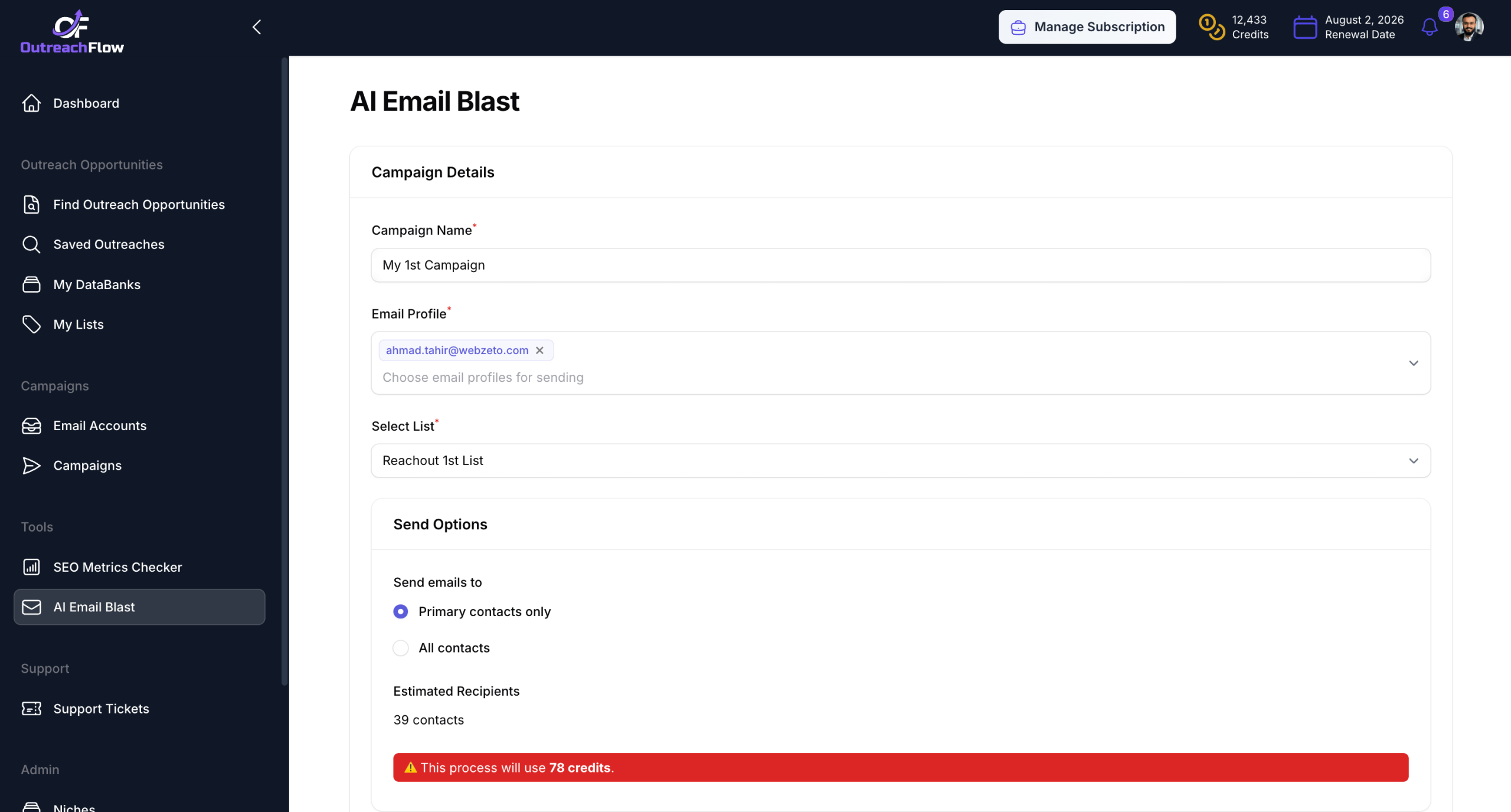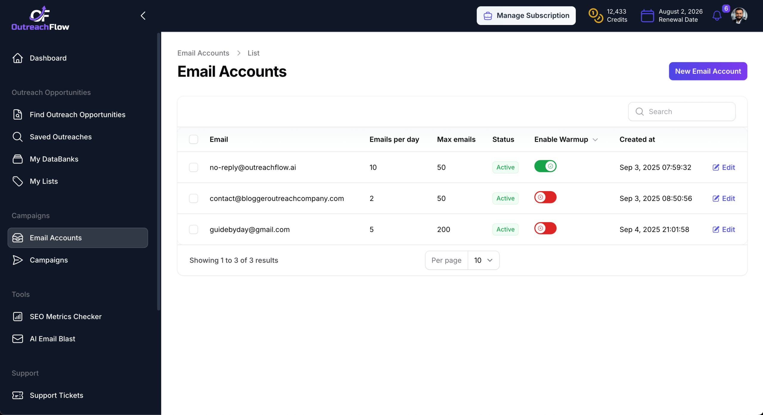 Before the first email ever leaves your outbox, OutreachFlow runs warm-up cycles to build trust with mail providers.